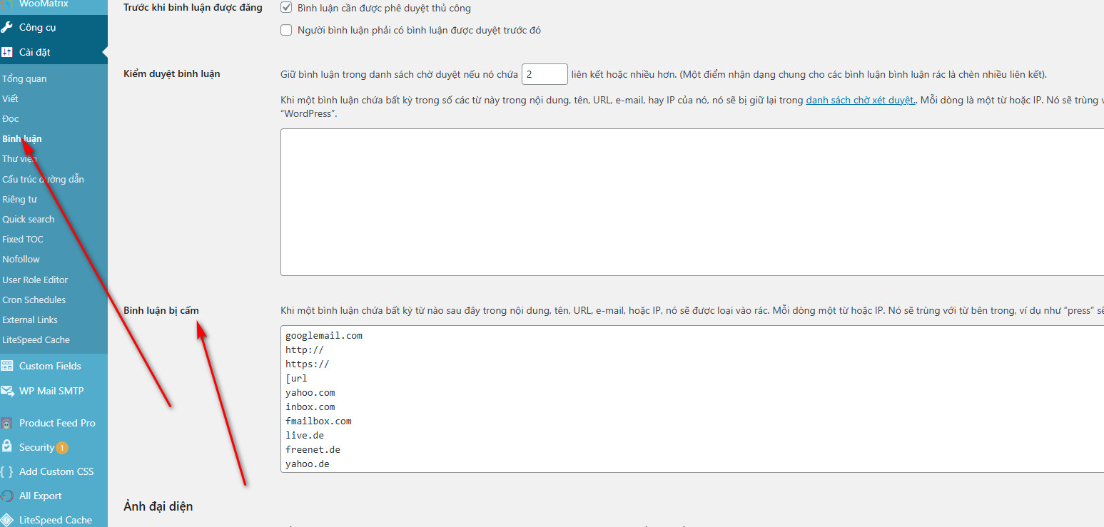 - Vào admin > Cài đặt > Bình luân, tìm mục “Bình luận bị cấm”