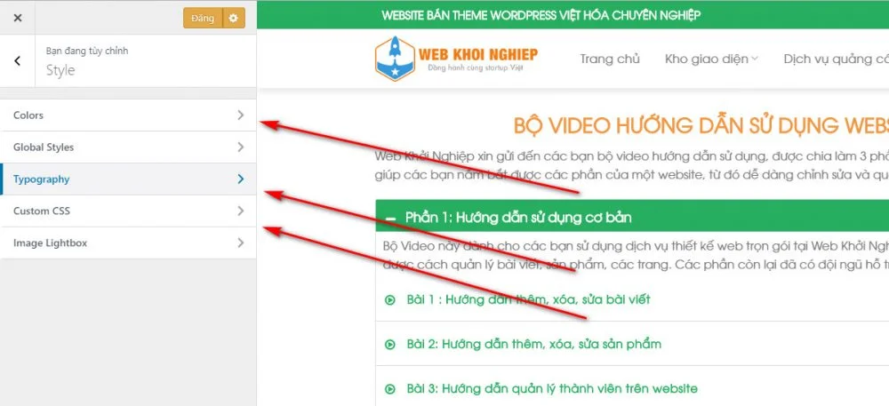 Ở mức độ cơ bản, ở phần này các bạn chỉ cần quan tâm tới 3 phần chính cho mình, đó là Colors, Typography và Custom CSS: