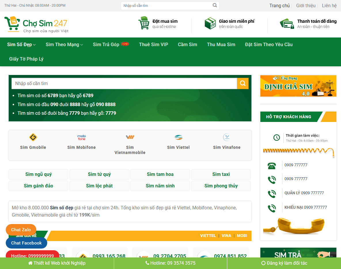 Theme được thiết kế với giao diện hiện đại, màu sắc hài hòa phù hợp với ngành sim số. Menu navigation rõ ràng giúp khách hàng dễ dàng tìm kiếm thông tin.